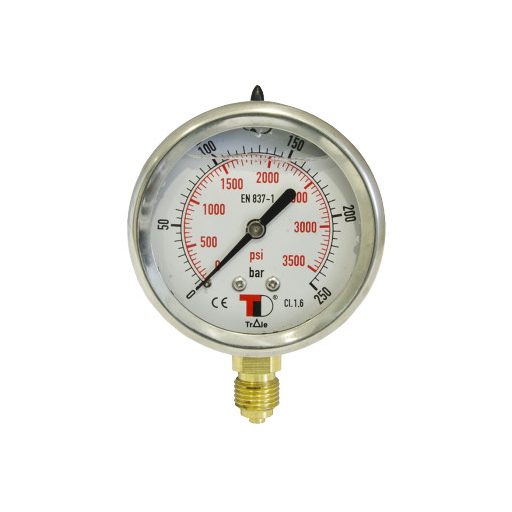 Dies ist ein glyzerin-gefülltes Manometer mit DN 63 Durchmesser und unterem Anschluss mit 1/4" BSP-Gewindeanschluss. Die Glyzerinfüllung dämpft Vibrationen und Druckspitzen und sorgt für eine stabilere und genauere Ablesbarkeit in Hydrauliksystemen und industriellen Anwendungen. Das Instrument verfügt über eine doppelte bar/psi-Skala sowie die Schutzart IP65, wodurch ein zuverlässiger Betrieb auch in staubigen oder feuchten Umgebungen gewährleistet ist.